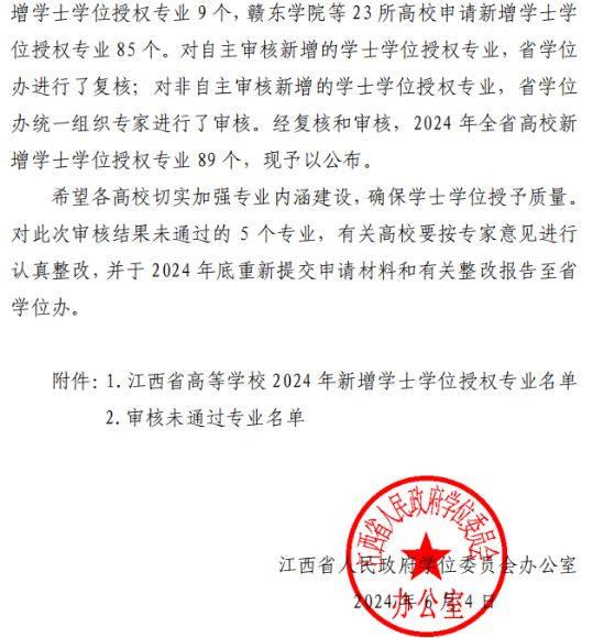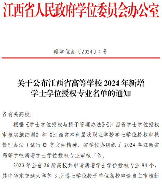 近日,江西省人民政府学位委员会办公室下发了《关于公布江西省高等学校2024年新增学士学位授权专业名单的通知》(赣学位办〔2024〕4号),我校跨境电子商务、虚拟现实技术和智能建造三个专业新增为学士学位授予专业,获得学士学位授予权。