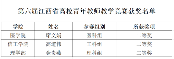 6月27至6月29日,第六届江西省高校青年教师教学竞赛决赛在赣南师范大学举行。此次决赛汇聚了全省众多高校的150名优秀青年教师。我校经过层层选拔,最终由医学院的席文娟团队、信息工程学院的高道伟团队、理学教学部的金贵燕团队代表学校参赛。