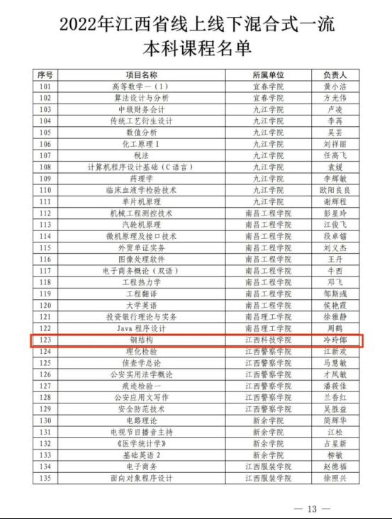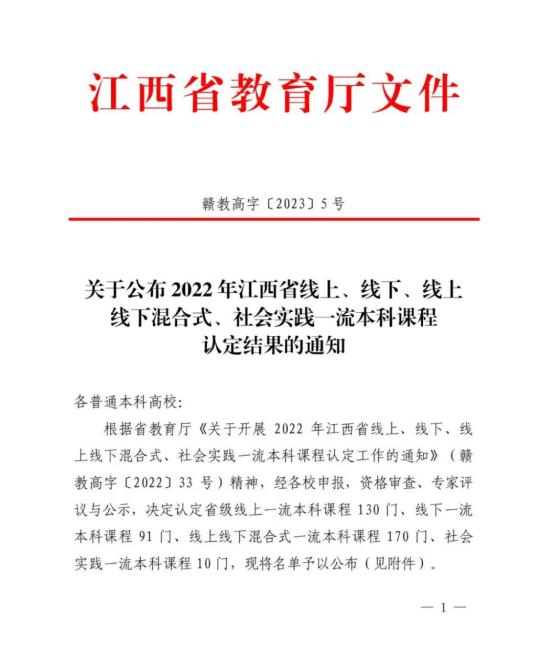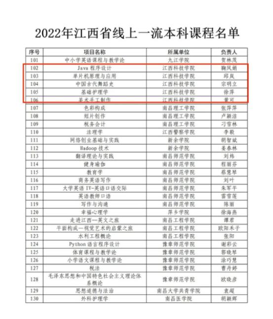近日,江西省教育厅公布了2022年江西省线上、线下、线上线下混合式、社会实践一流本科课程认定结果,我校《Java程序设计》等7门课程获批认定。其中,线上一流本科课程5门,线上线下混合式一流本科课程1门,社会实践一流本科课程1门。