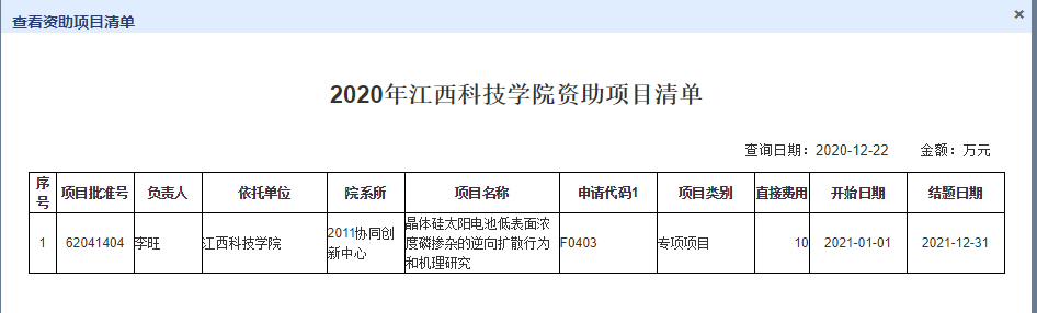 近日,国家自然科学基金委公布2020年度国家自然科学基金项目立项结果,我校协同创新中心李旺博士主持申报的“晶体硅太阳电池低表面浓度磷掺杂的逆向扩散行为和机理研究”获批立项,资助金额10万元。自2016年突破国家自然基金项目后,我校连续5年获批国家自然科学基金项目立项资助,立项总经费(直接经费)196万元。